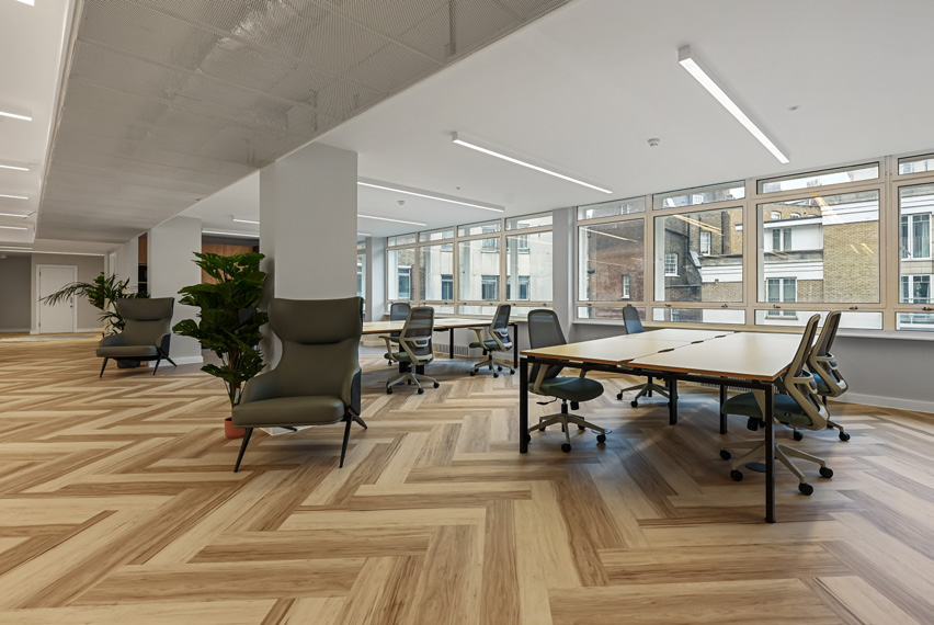 This corner building is accessed by way of a manned reception. A passenger lift serves all floors. The office accommodation has been fully refurbished to a CAT A + specification, providing a raised floor, comfort cooling, plaster ceiling and LED lights. The accommodation is fitted to provide 2x meeting rooms, hot desking and space for 34 desks.